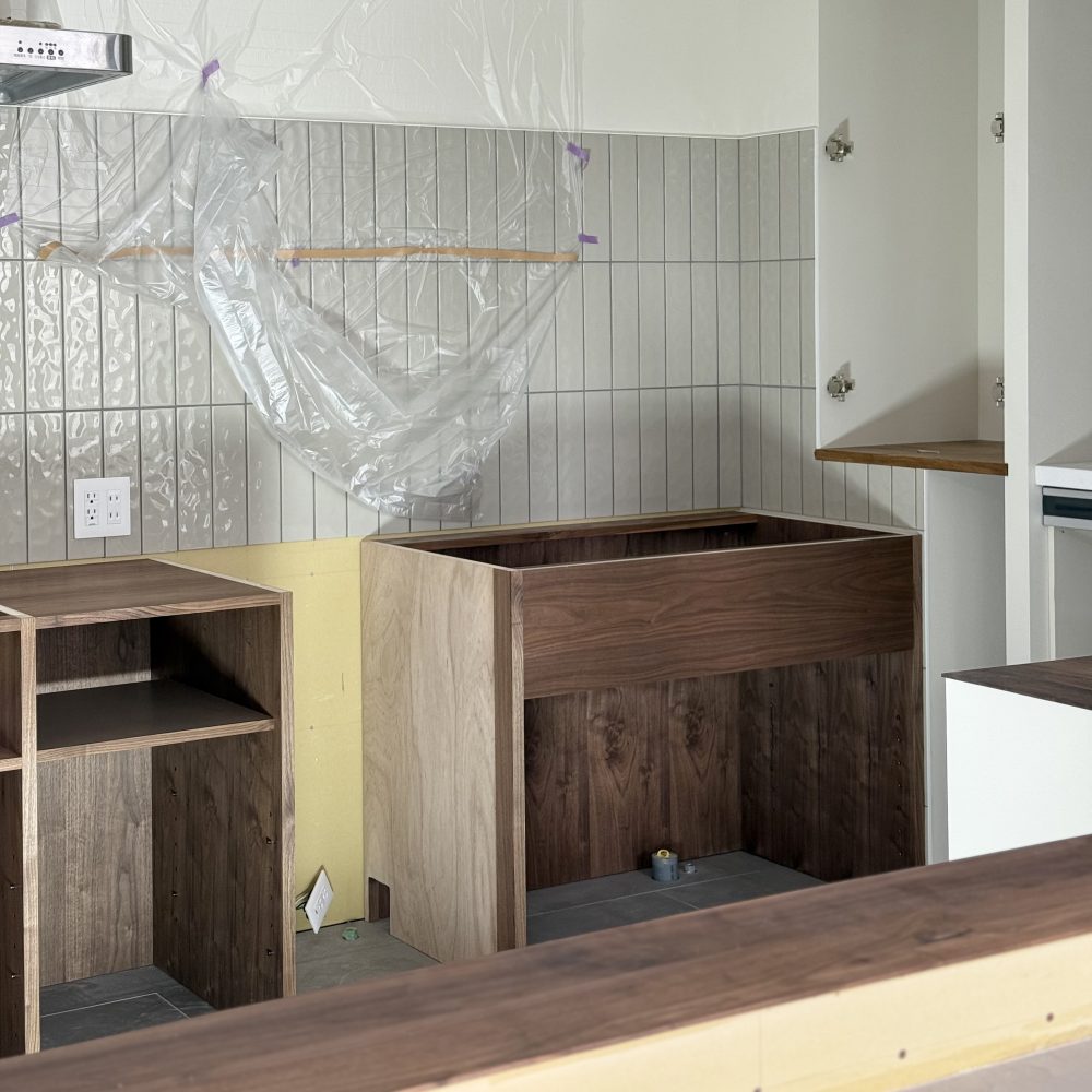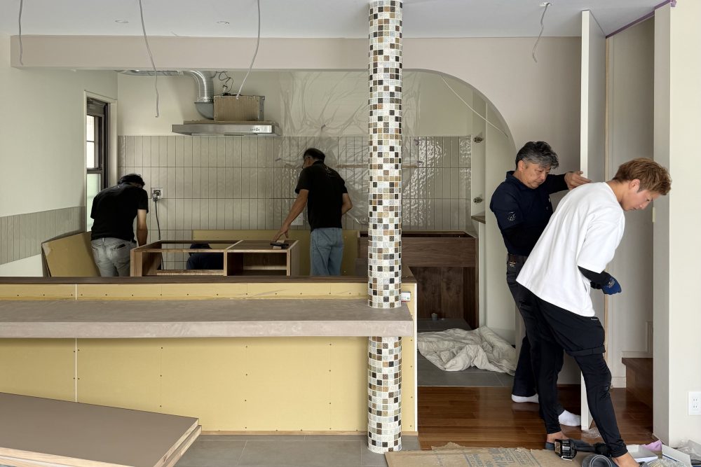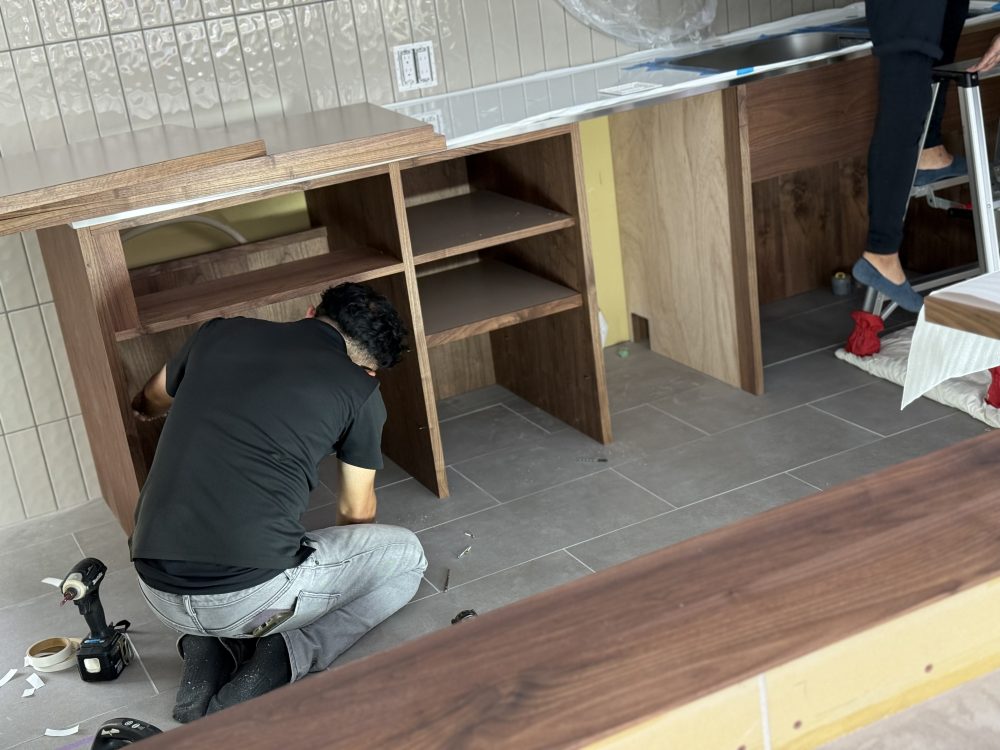 オーダーメイドの厨房キッチンやドアが次々と取り付けられています。